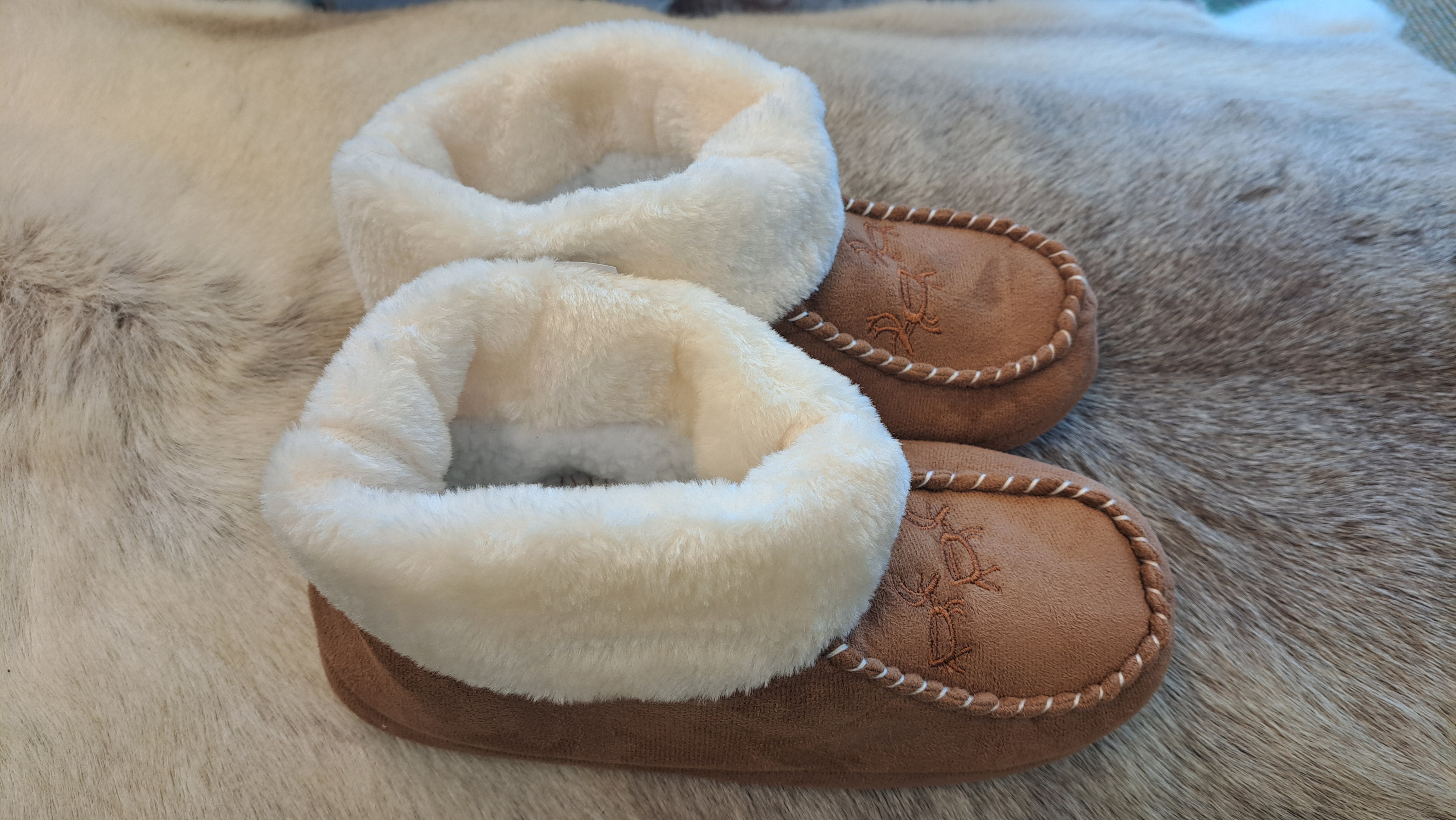 Tossujen ulkopuoli on kauniin ruskeaa mokkapintaa, ja päällä on tyylikäs tikkikoristelu sekä pienet porokuvioinnit, jotka tuovat niihin ripauksen pohjoista tunnelmaa.
