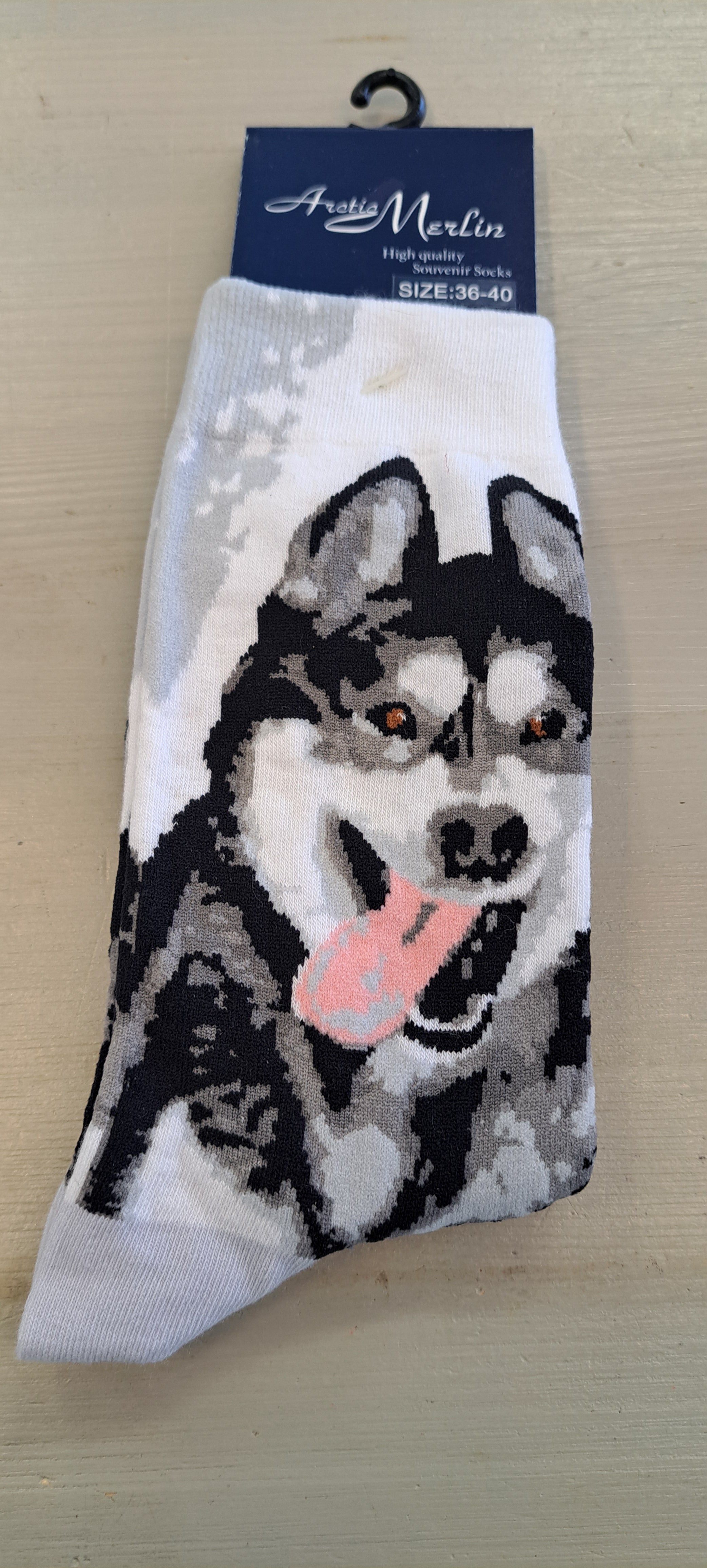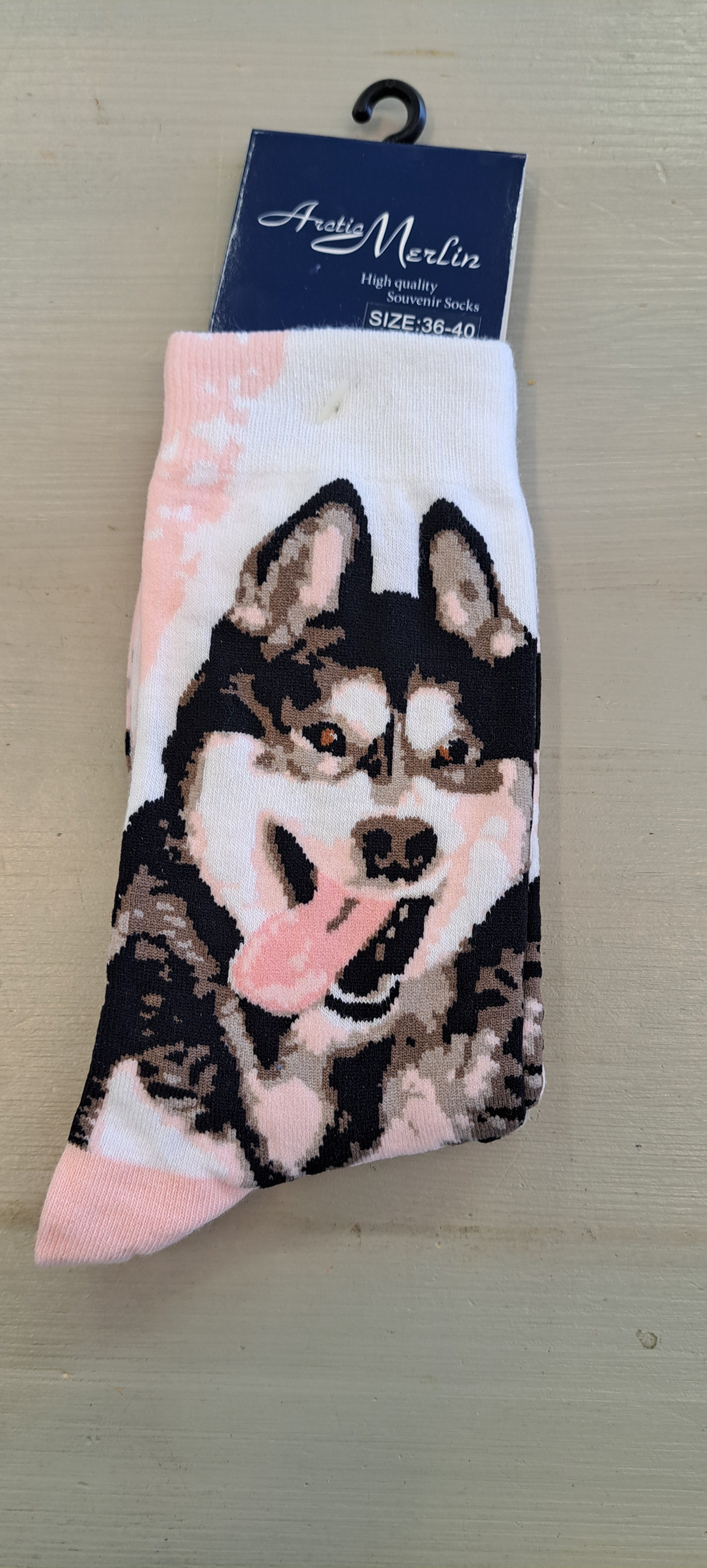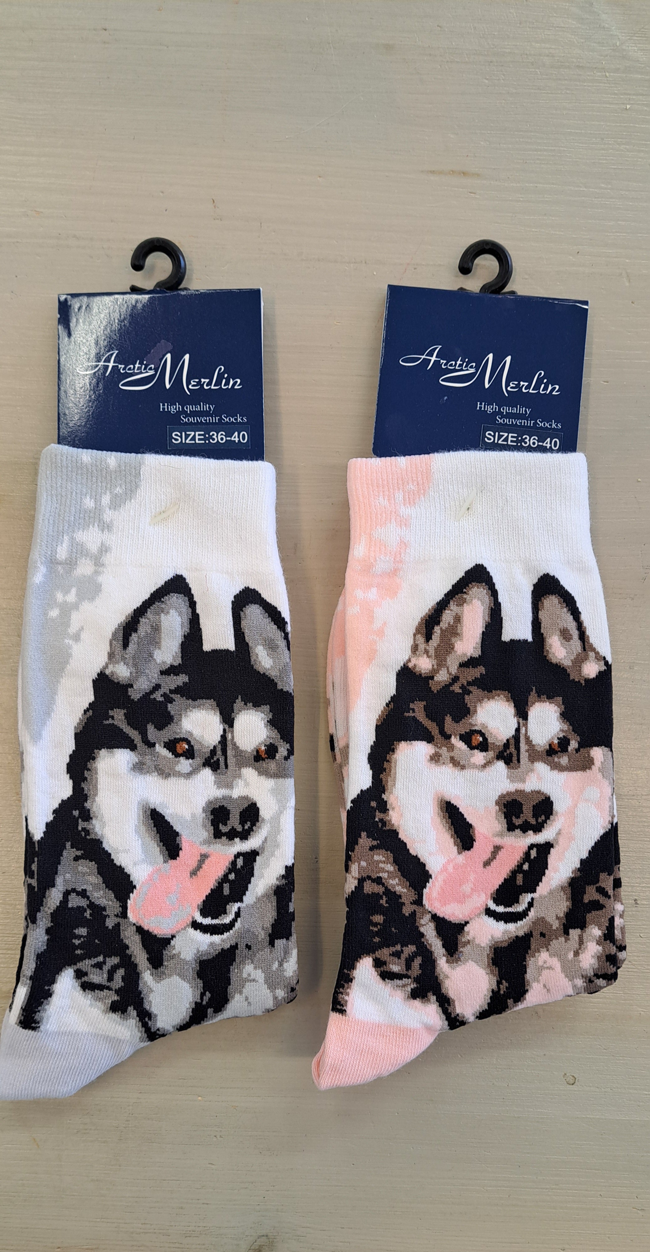 Hauskat ja näyttävät sukat koiran ystävälle! Näissä pehmeissä sukissa on suloinen husky-kuvio, joka tuo persoonallista ilmettä arkeen. Valittavana kaksi tyylikästä värivaihtoehtoa: klassinen harmaa ja hempeä roosa.